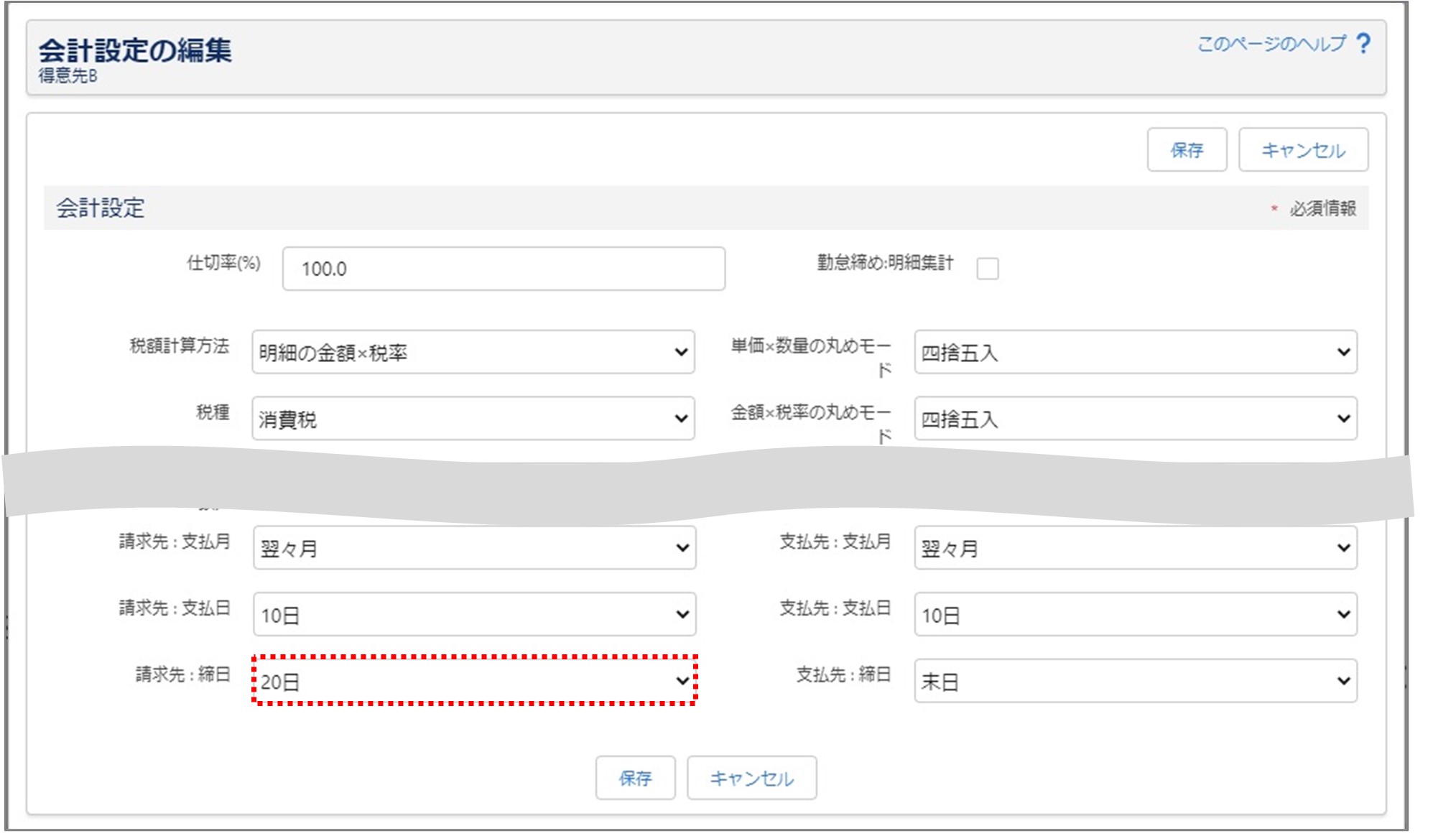 また、「請求先」の「会計設定」が次のように設定されているとします(締日=20日)。 - まず、当月の19日(2020/12/19)に「請求」の登録を行います。