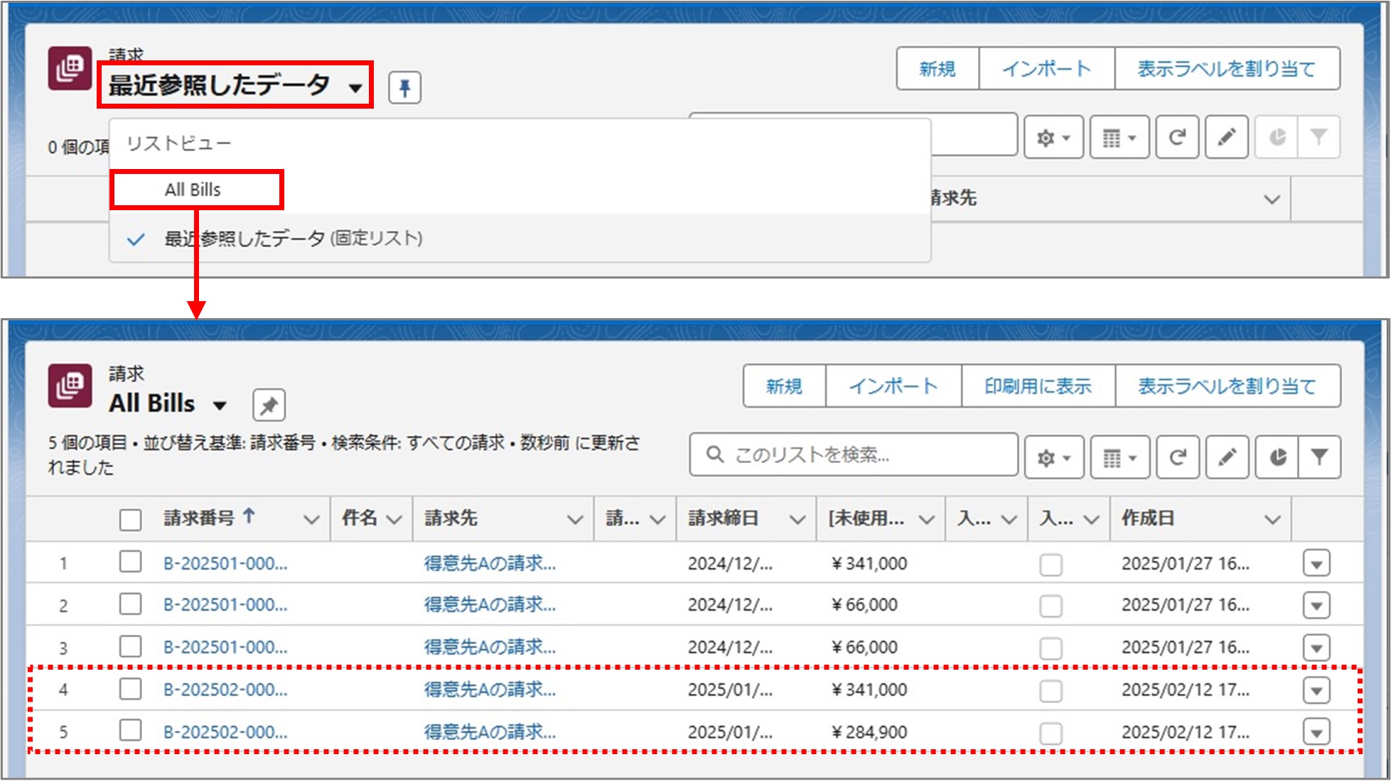 Point(5) - 請求一括登録バッチによって作成された「請求」は、「請求」のリストビュー「最近参照したデータ」の初期画面には表示されません。