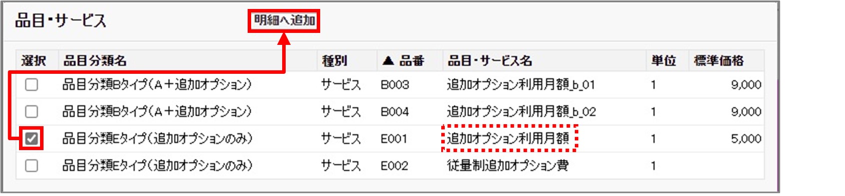 - 明細に追加する品目・サービスにチェックを付け[明細へ追加]ボタンをクリックします。