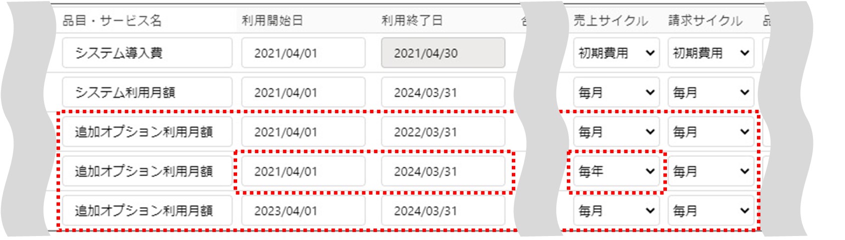 - 「追加オプション利用月額」は、1年ずつ3件の明細に分割されて追加されます(1対3の関係)。