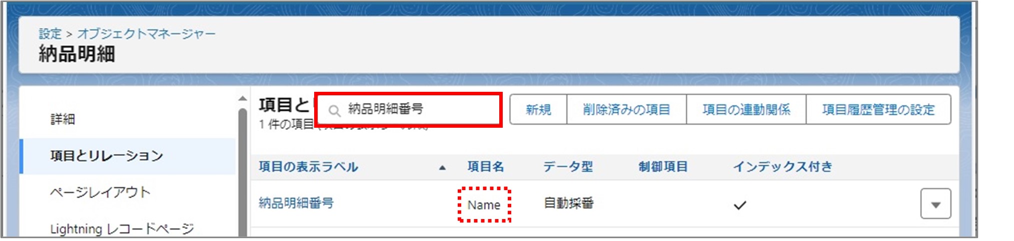 Point(2) 当該項目のAPI参照名は、設定の「ホーム」画面から[オブジェクトマネージャ]タブ>[{オブジェクト名}]リンク>[項目とリレーション]をクリックし、クイック検索で項目の表示ラベルを検索すると確認できます。