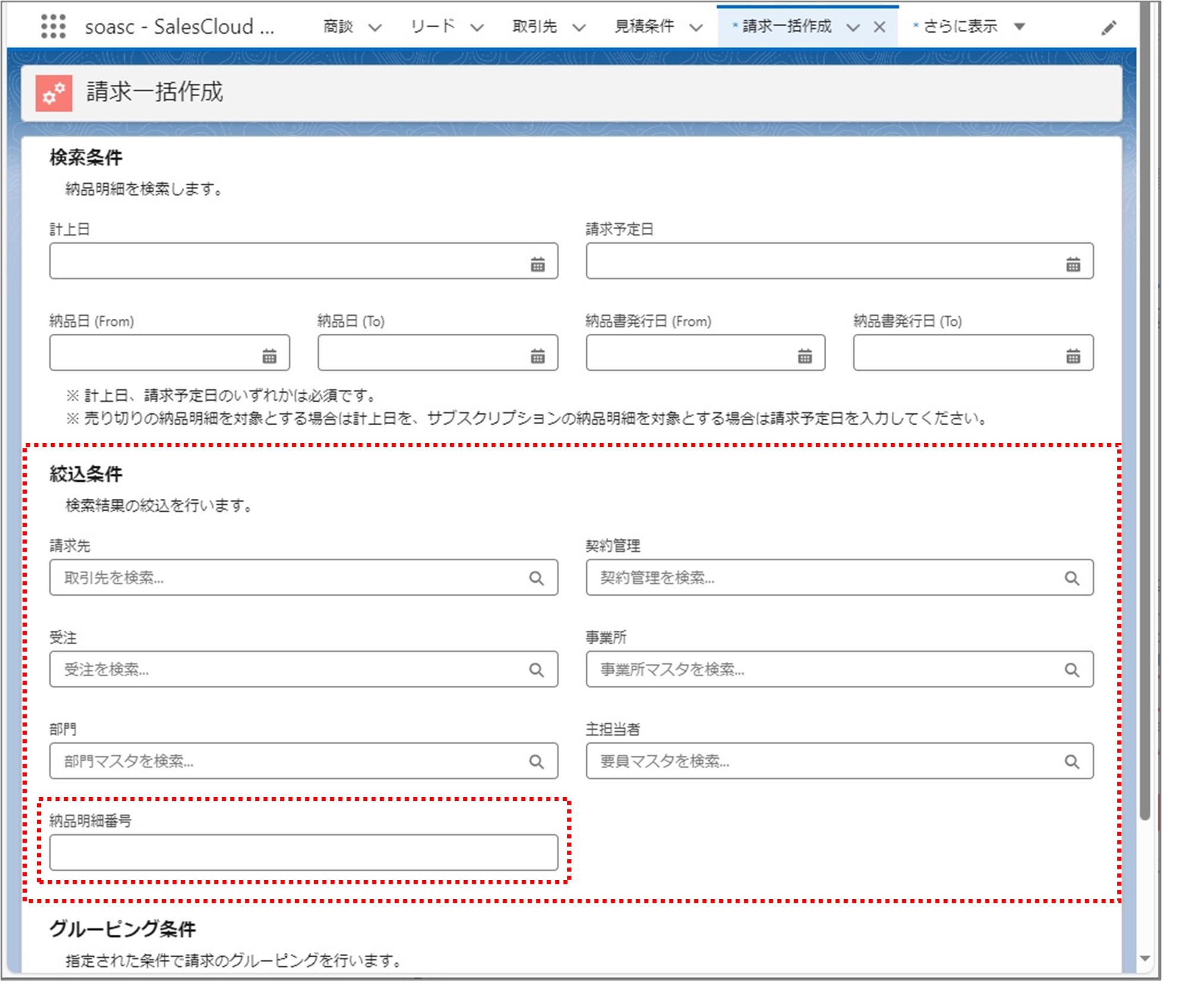 「請求一括作成」画面の「絞込条件」に項目を追加する設定です。