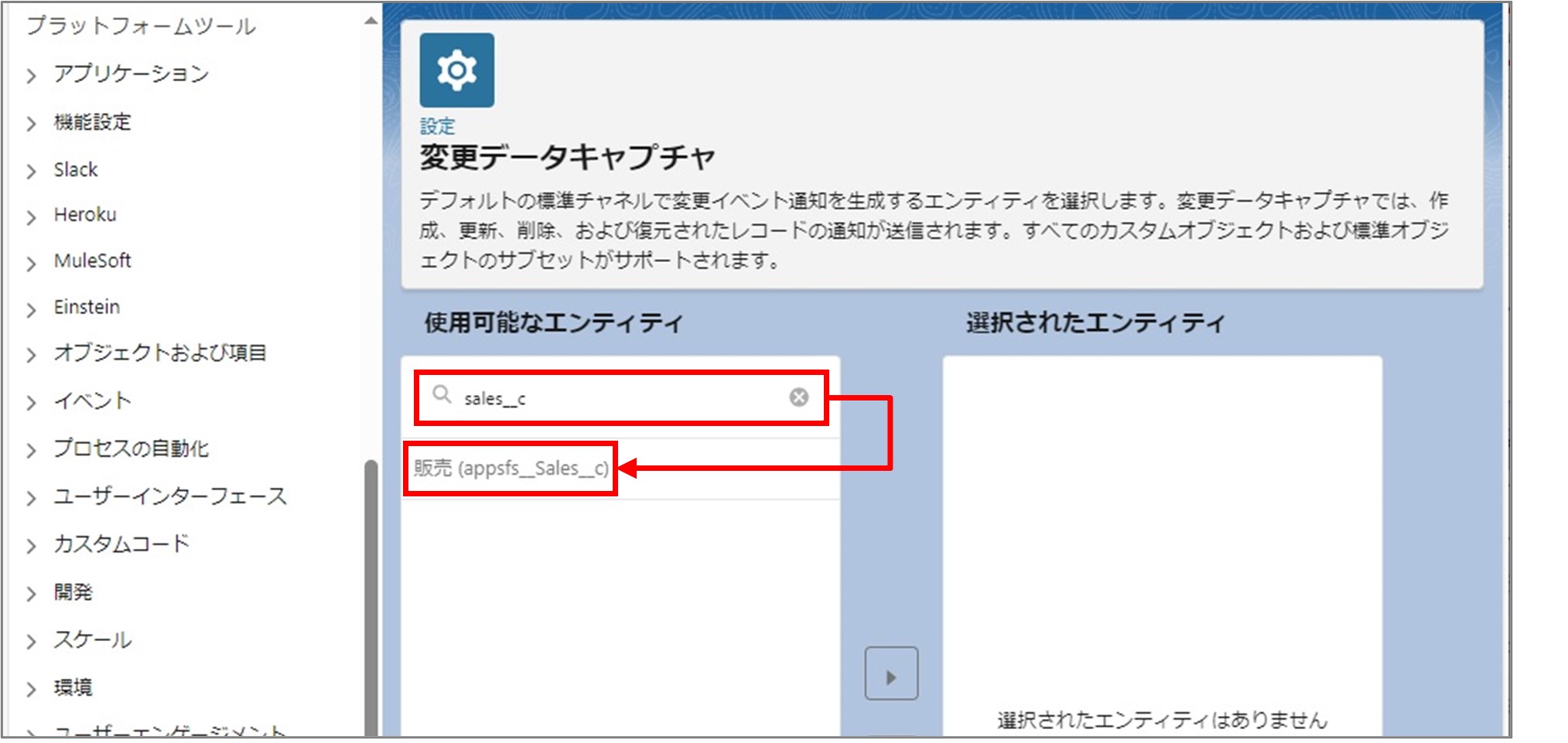 日本語での検索は無効です。検索キーは、必ず英語で入力してください。 - [▶]をクリックします。「販売 (Appsfs_Sales__C)」が「選択されたエンティティ」に移動します。