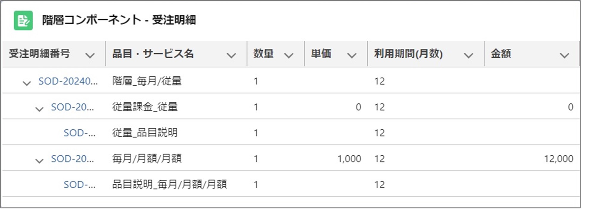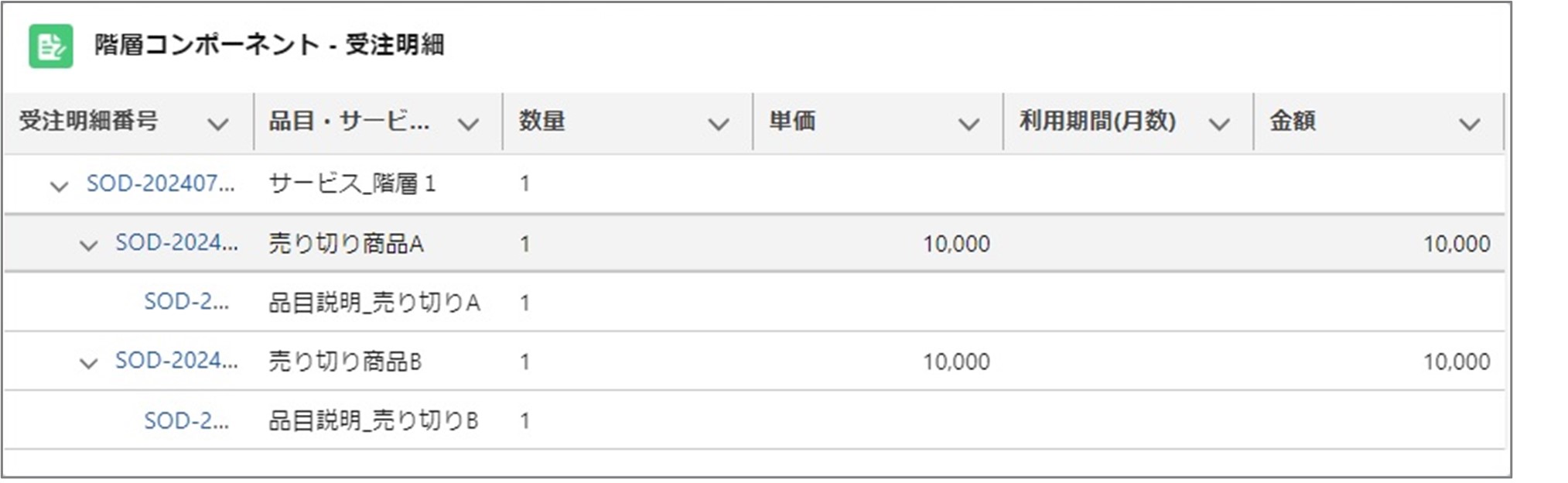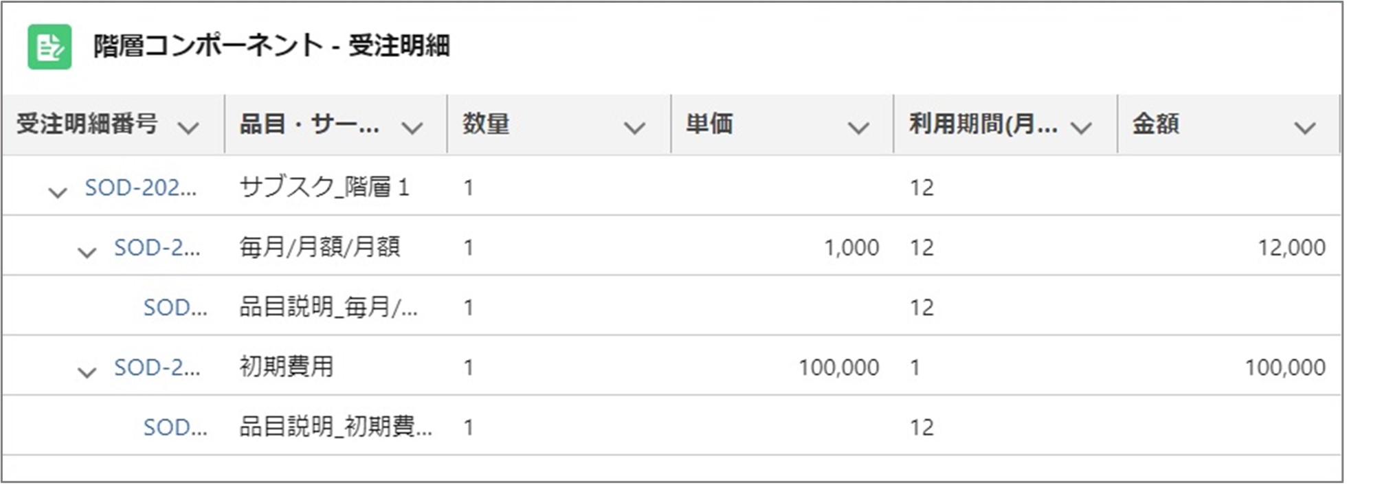 ここでは例として、次のような階層構造の「見積明細」を作成します。 - 手順2の「見積」の詳細画面(関連リスト)から受注データを作成します。