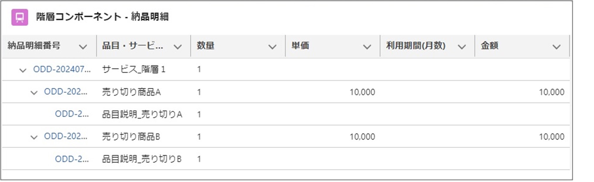 ◆「受注明細」の階層コンポーネント ※「受注」詳細画面の関連リストにあります。◆「納品明細」の階層コンポーネント ※「納品」詳細画面の関連リストにあります。