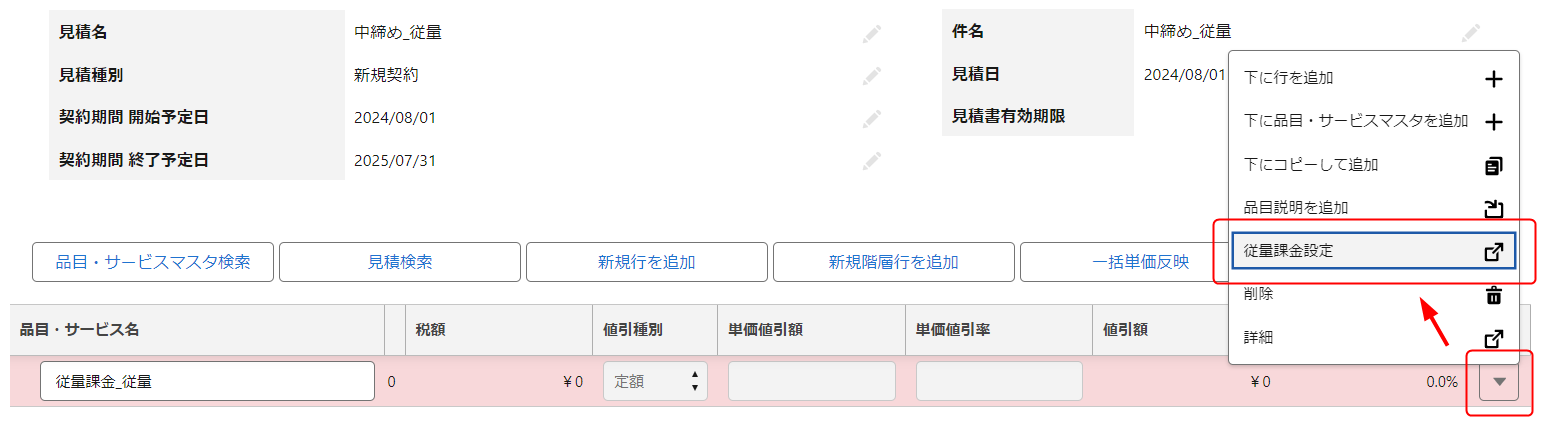 従量課金の品目・サービスを明細に追加し、「見積明細」ごとに、従量課金設定を行います。