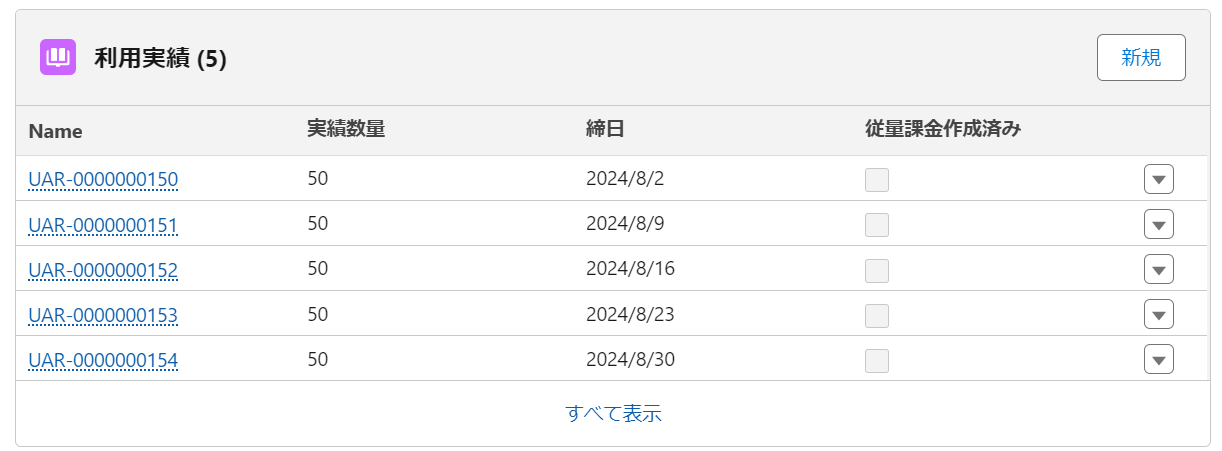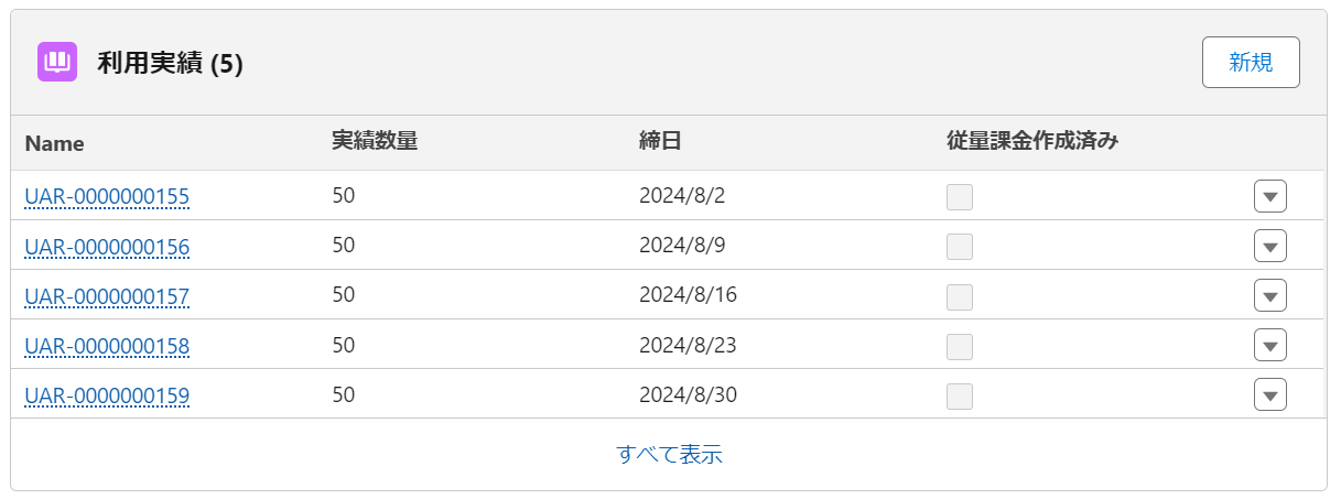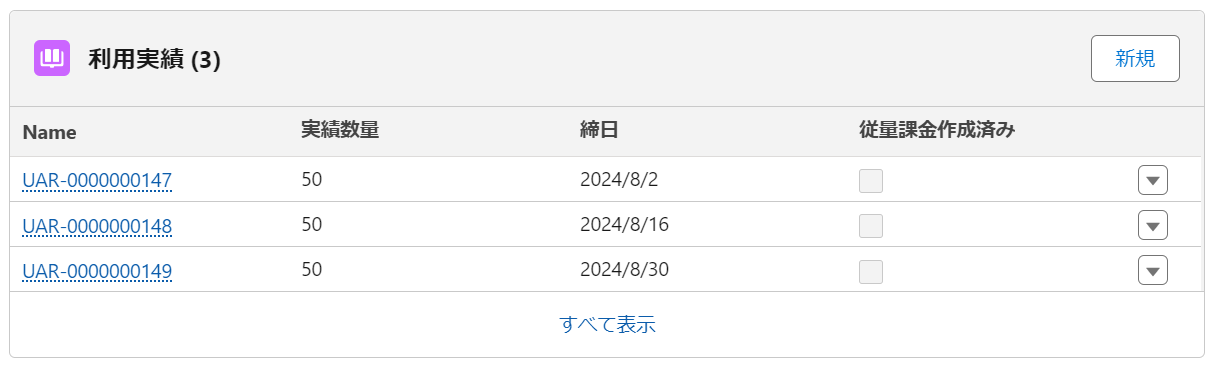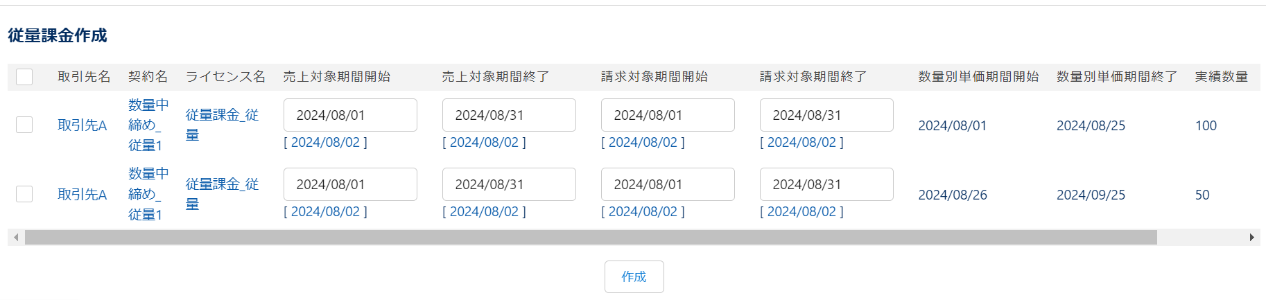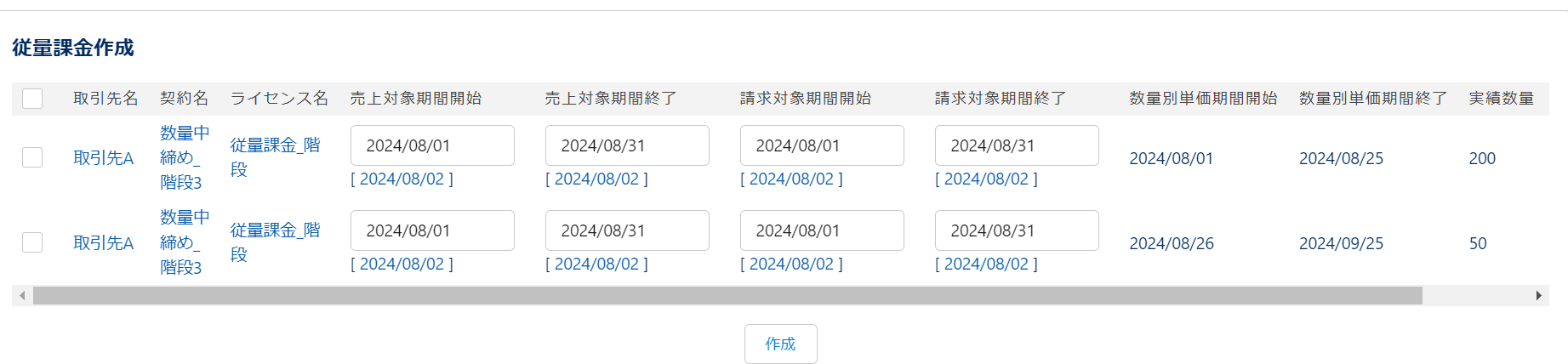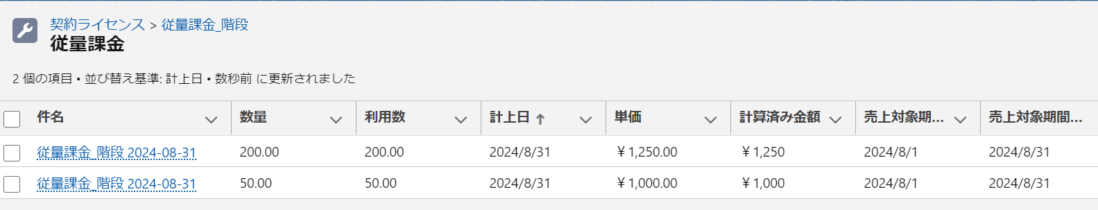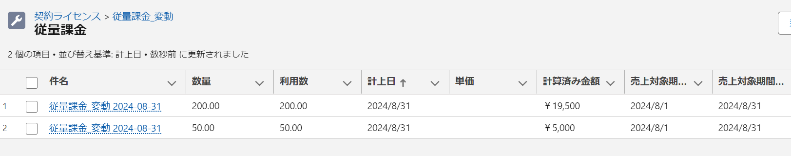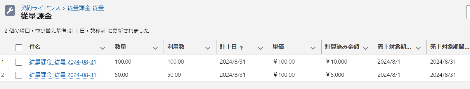 2024/08/25 に従量課金の累計がリセットされる設定としているため、「利用実績」の「締日」が 2024/08/25 以前か翌日以降かを基に、「従量課金」が作成されます。ここでは、次の2件が作成されます。