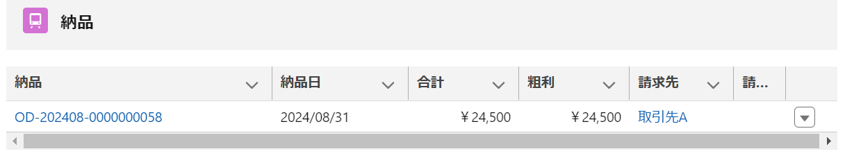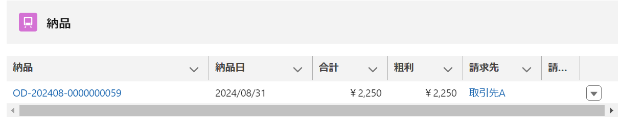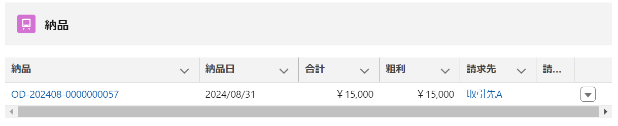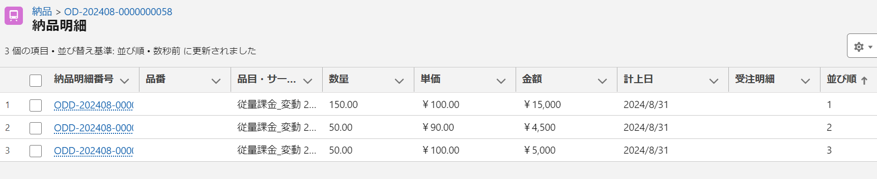 2024/08/25 に従量課金の累計がリセットされる設定としているため、1件の「納品」に紐づく「納品明細」が2件になります。