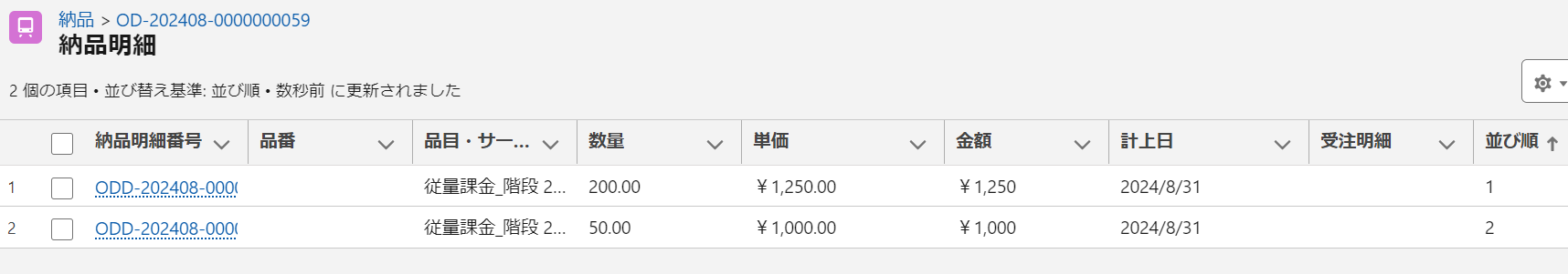 「従量課金種別」=「階段」ですが、2024/08/25 に従量課金の累計がリセットされる設定としているため、「納品」に紐づく「納品明細」は2件になります。